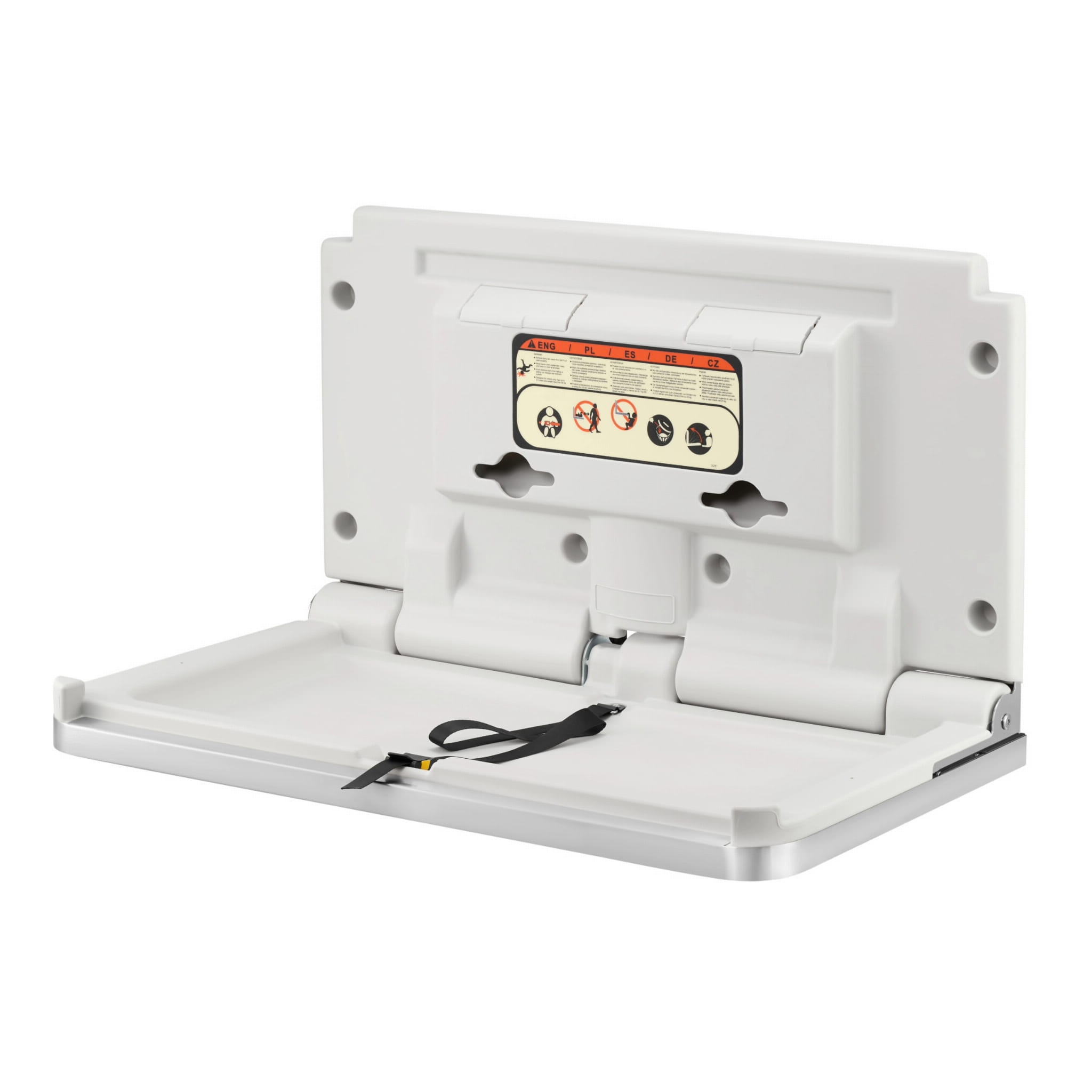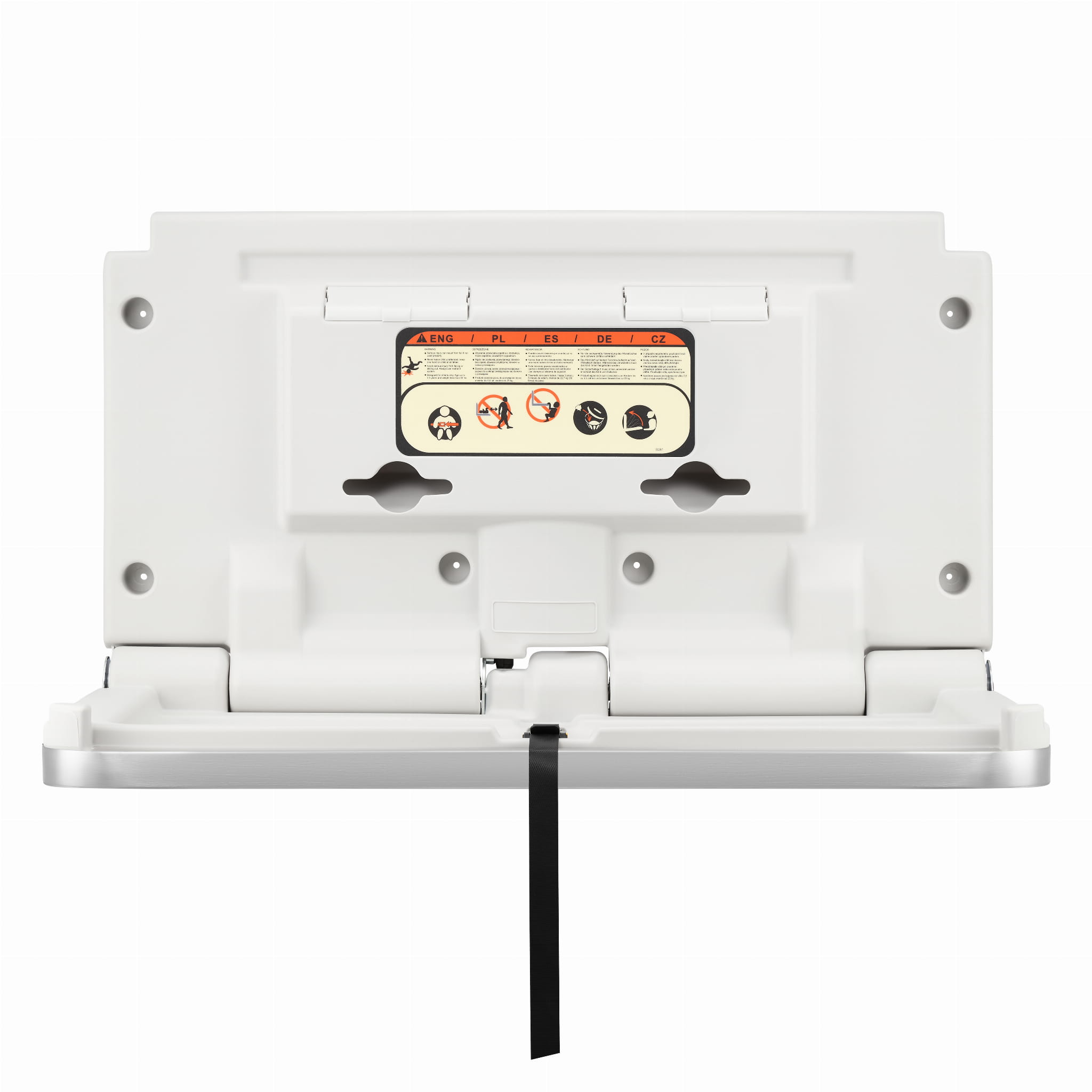 Przewijak dziecięcy montowany na ścianie, w obudowie ze stali nierdzewnej. Przewijak wykonany z polietylenu, otwierana część zamknięta w obudowie ze szczotkowanej stali nierdzewnej 304.